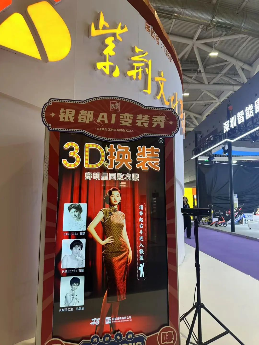舞台中央展出紫荆文化集团旗下银都机构数十部香港经典电影海报,运用AI技术实现静态海报动态视频转化,重现上世纪的光影记忆。舞台背后设有AI互动装置“银都时光机”,以银都机构经典电影戏服为素材进行AI活化,观众可体验变身电影主角,沉浸式感受经典电影魅力。通过光与影的交错融合,编织出一场视听盛宴,让观众深刻感受文化的力量与科技的魅力。