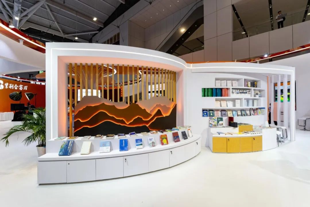 位于展厅中央的签约发布区配备了LED大屏与折叠椅,观众可驻足观看紫荆文化集团旗下联合出版集团、大同出版传媒有限公司举办的发布和签约活动,共同见证项目落地。文创产品区以枝干形态延展的360度展柜组成,观众可观赏或购买集团各直属企业的文创衍生品,解锁文创潮玩新体验。
