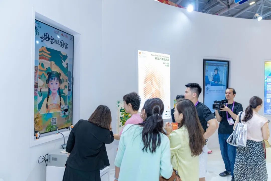 相邻的中外文化交流区以墙壁沿着空间结构延伸而成,观众可体验“当国宝遇到国宝”互动设备,借助AI生成能力,在故宫场景、熊猫元素的基础上,屏幕轻触间即可生成观赏性、趣味性强的图片和视频,还可现场打印成照片作为纪念,将文化体验定格在瞬间。